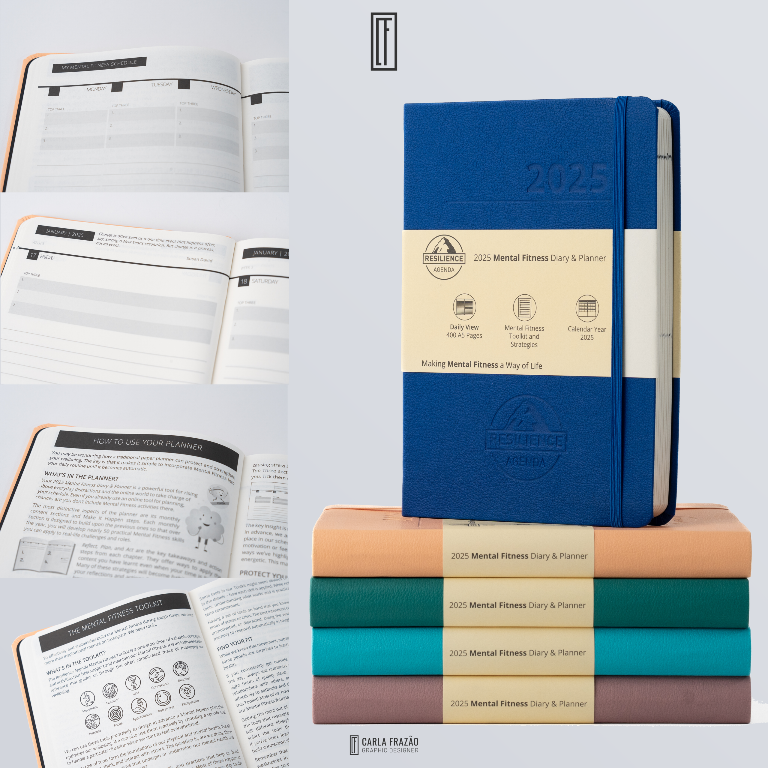 As the annual designer for Resilience Agenda's flagship product since 2020, I manage the complete production lifecycle of four market-specific diary variants: Australian and European editions, each available in daily and weekly formats.